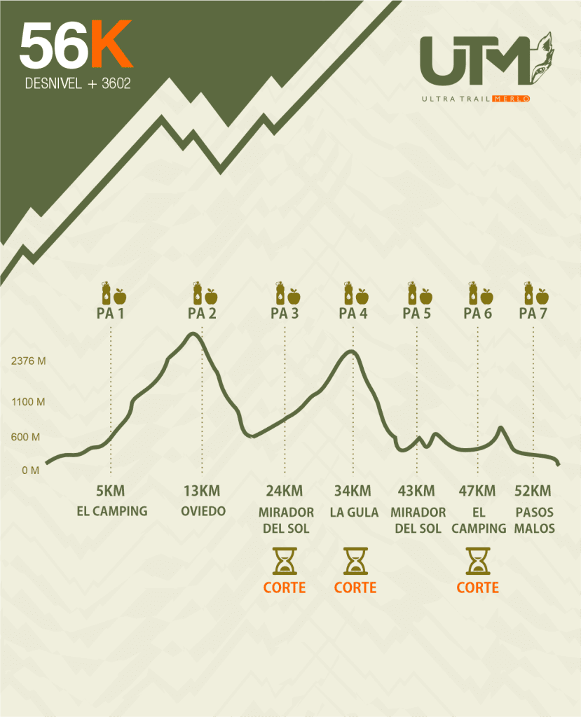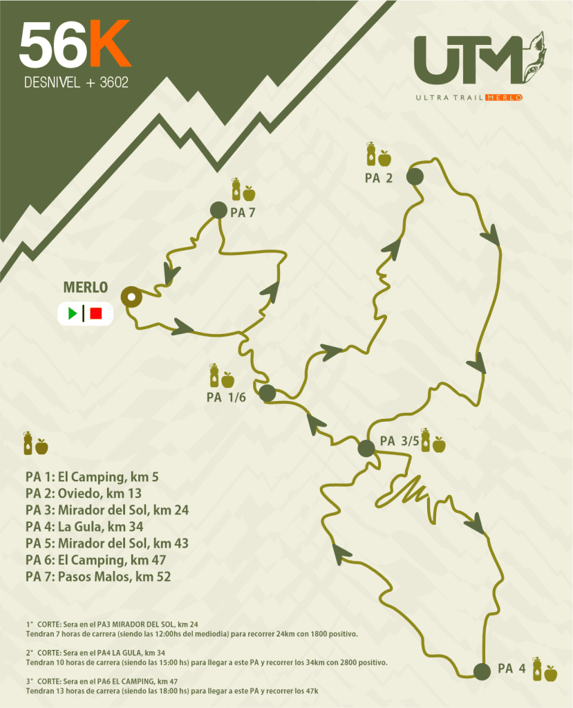 En este punto enfrentarán un desafío inédito para el trail nacional: el ascenso por un tramo de asfalto, conocido como la Cuesta del Tren, hasta alcanzar el filo de Merlo. Desde allí se continúa por un camino de ripio hasta el PA4 LA GULA, KM 34. Para llegar a este puesto habrán completado un ascenso de 10 km con cerca de +1.000 m.